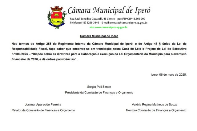Nos termos do Artigo 258 do Regimento Interno da Câmara Municipal de Iperó, e do Artigo 48 § único da Lei de Responsabilidade Fiscal, faço saber que encontra-se em tramitação nesta Casa de Leis o Projeto de Lei do Executivo n.º009/2025 – “Dispõe sobre as diretrizes para a elaboração e execução da Lei Orçamentária do Município para o exercício financeiro de 2026, e dá outras providências”.