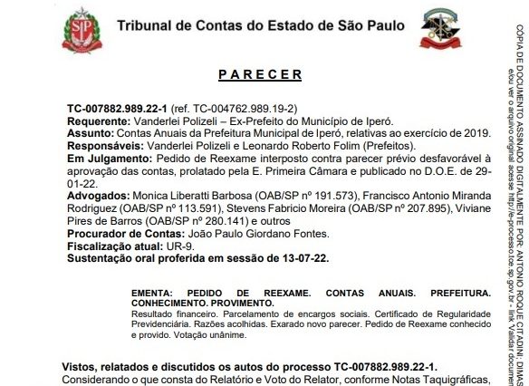 Câmara Municipal de Iperó Em cumprimento ao disposto no artigo 280, III do Regimento Interno da Câmara Municipal de Iperó PARECER PRÉVIO ÀS CONTAS DO EXECUTIVO – 2019. Sala de Sessões “Grácio Antonio Vieira” 05 de dezembro de 2022. Angelo Valário Sobrinho Presidente